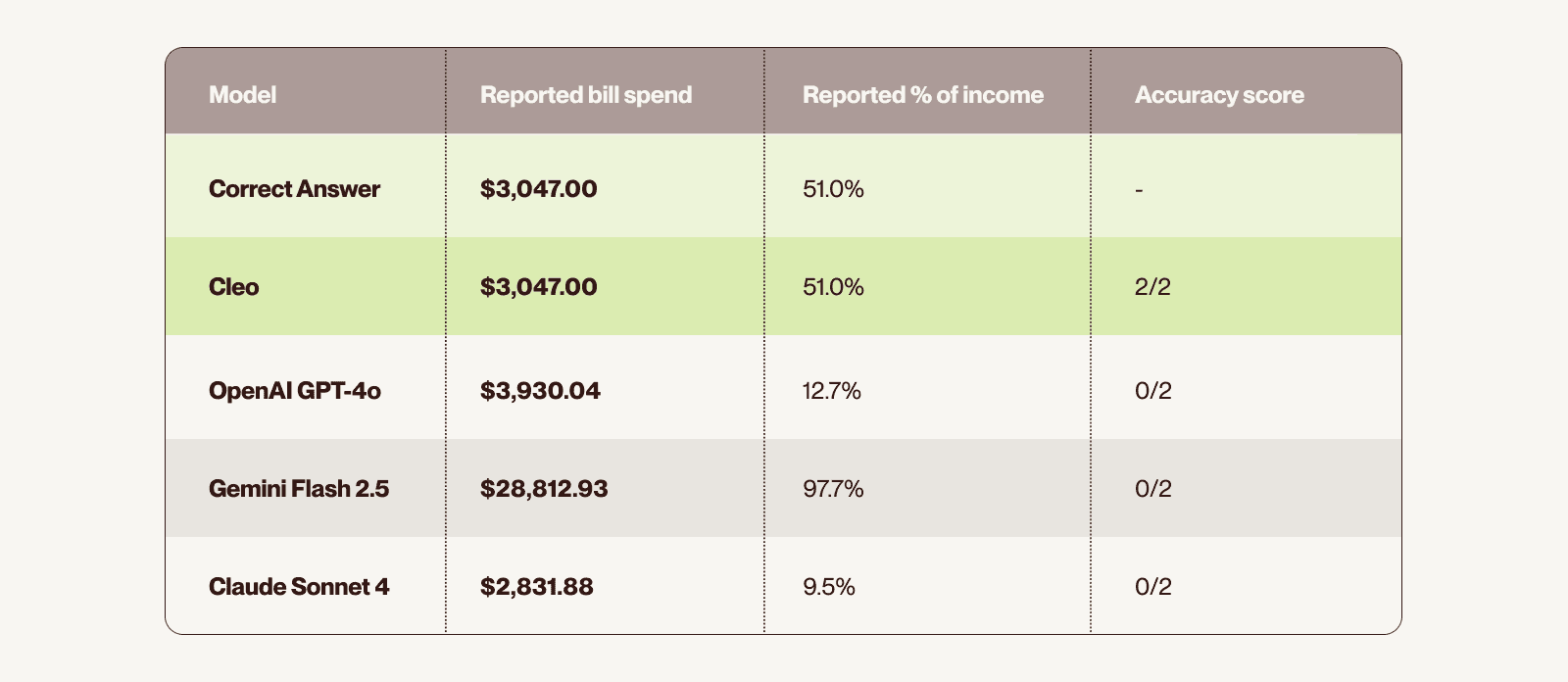 Only Cleo's agent-based system returned accurate results for both bill spend and percentage of income.