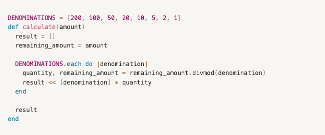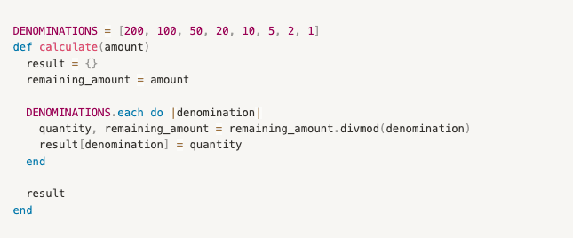 However, let’s consider our inputs here. We have only got one, amount, which is our N. The list of denominations, however, is static, and is always of size 7.