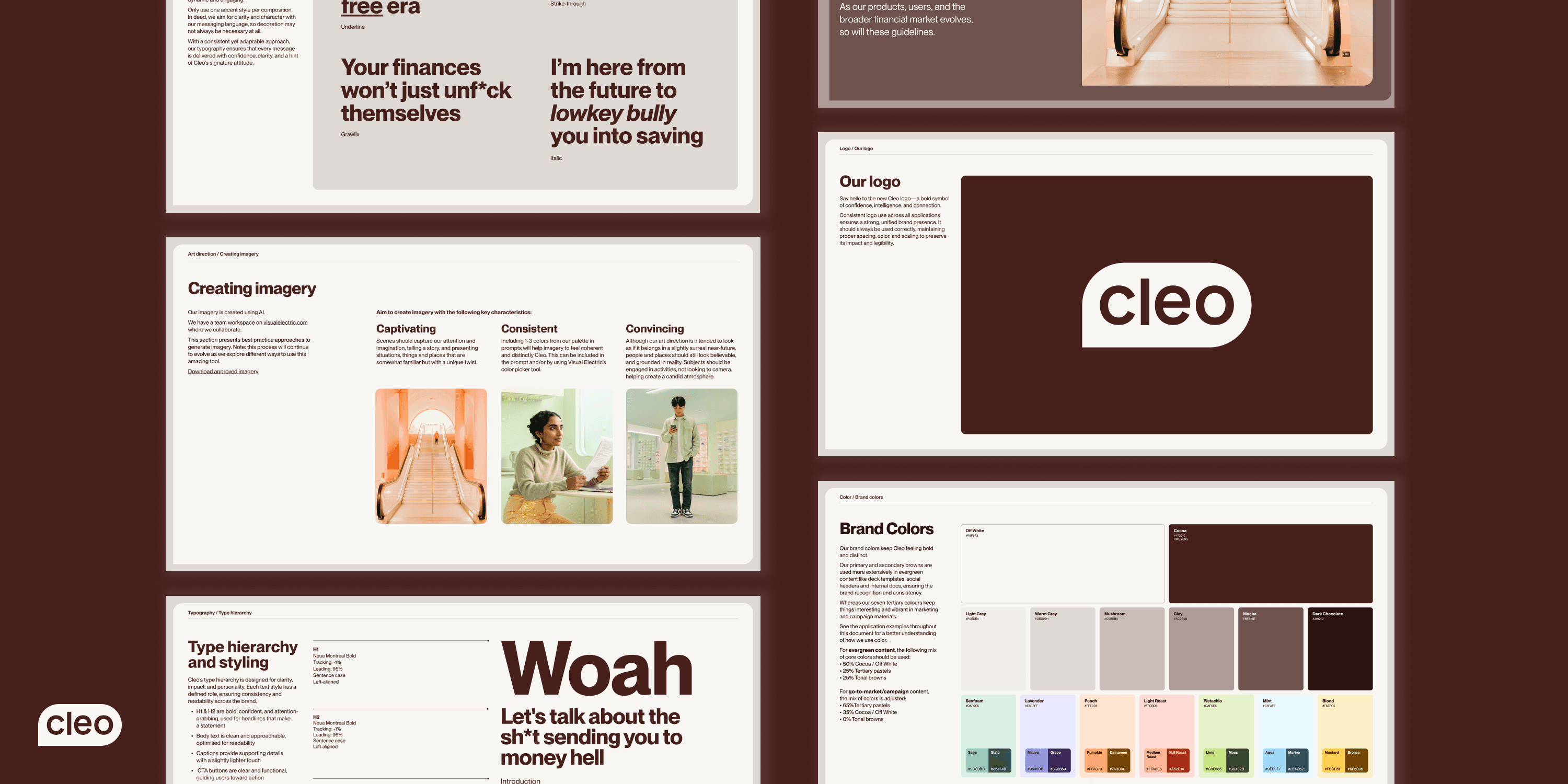 We started by rejecting the design tropes that dominate fintech and AI. While 75% of fintech brands lean blue to signal trust (guilty as charged!), we now choose warmth and depth. Cleo’s new signature color is a rich cocoa—grounded, inclusive, and calming in all the right ways. We like to think of it as trust, without the coldness. (And yes, we clocked that Pantone’s Color of the Year is Mocha Mousse. We were just a little ahead of the times.)