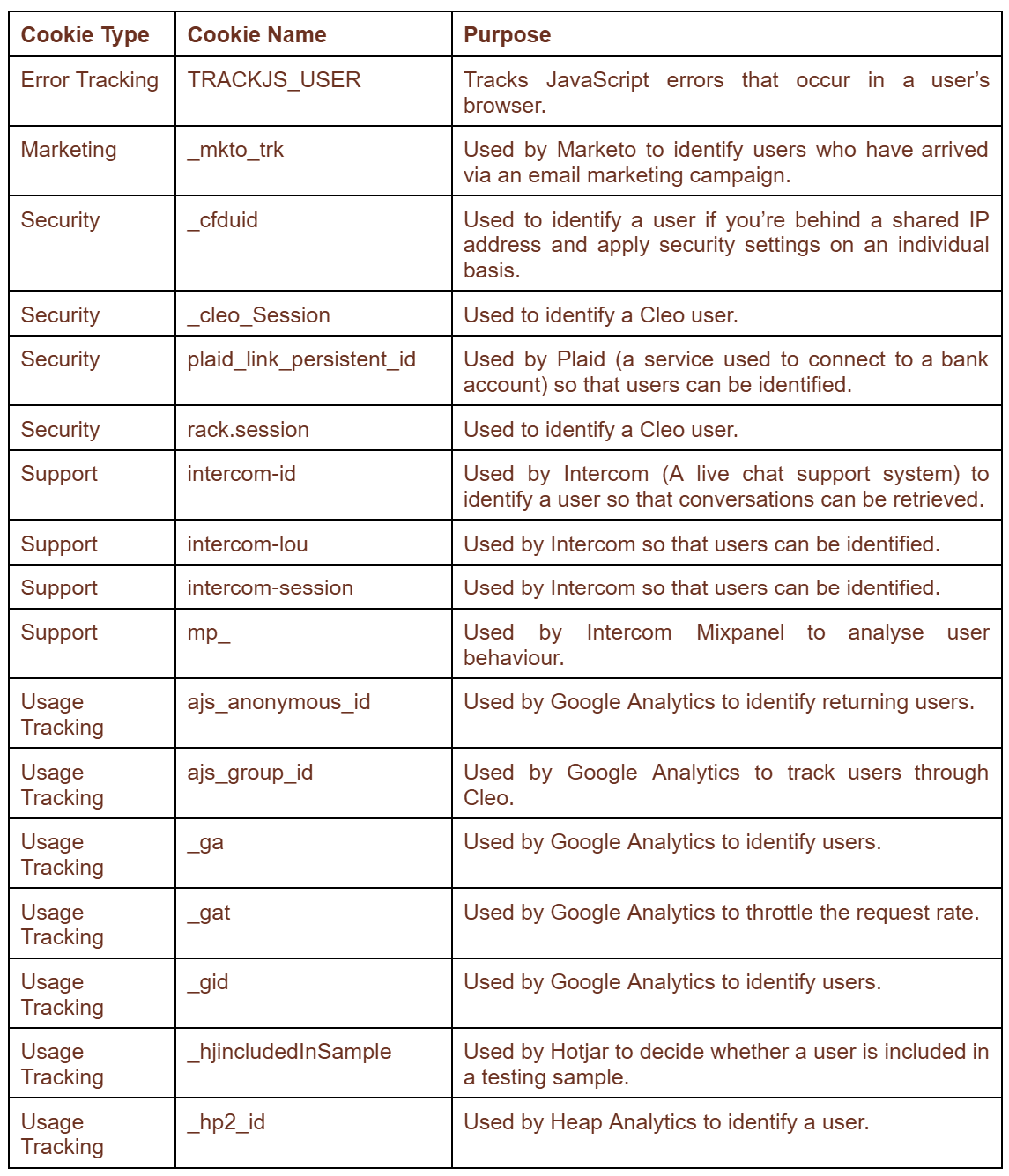 In addition to the cookies used on our website, our mobile application uses a single, strictly necessary cookie known as _cleo_session. This cookie is required to authenticate users and maintain their logged-in state within the app. It enables core functionality by ensuring the app can correctly identify the user and allow them to perform actions securely.
