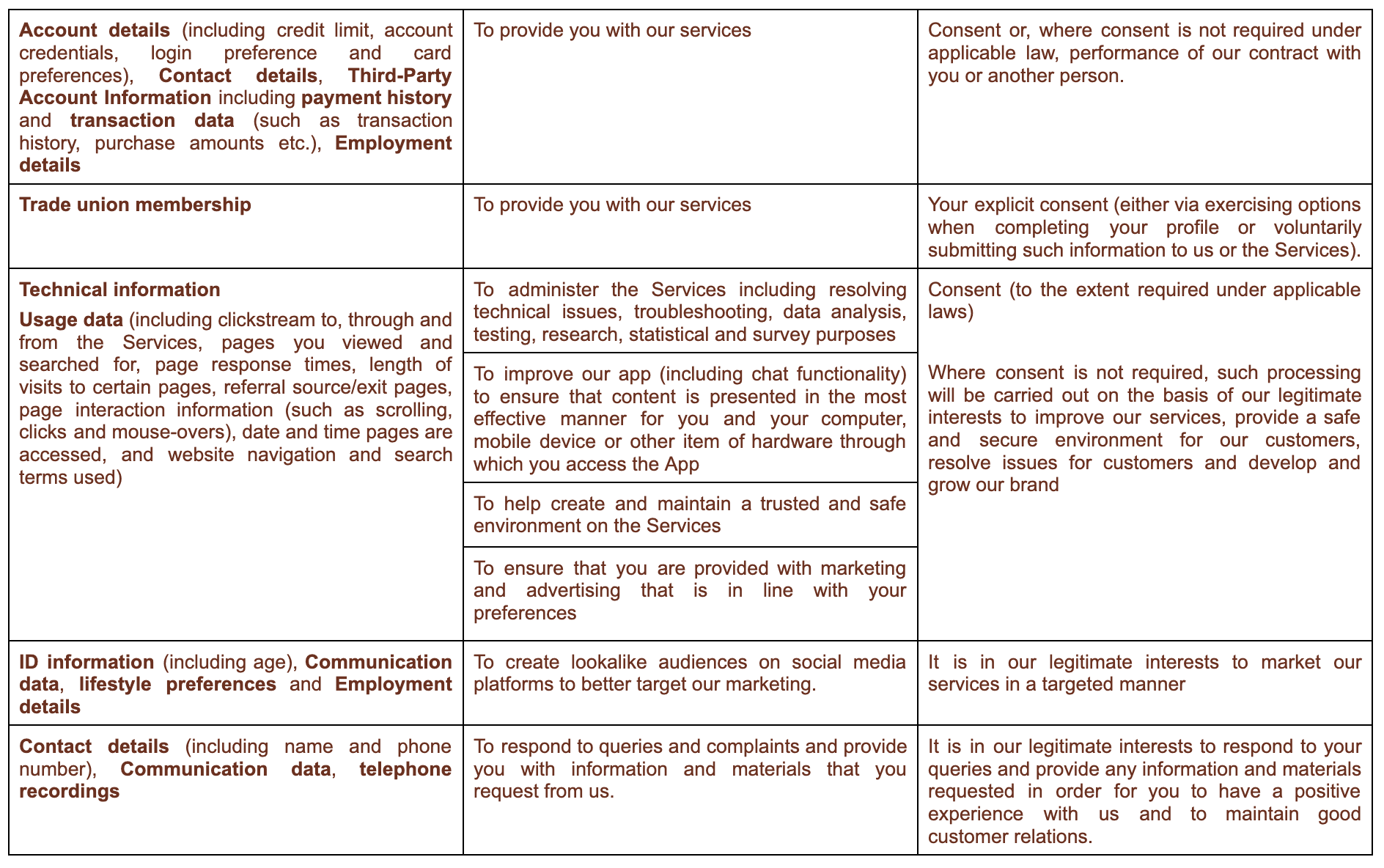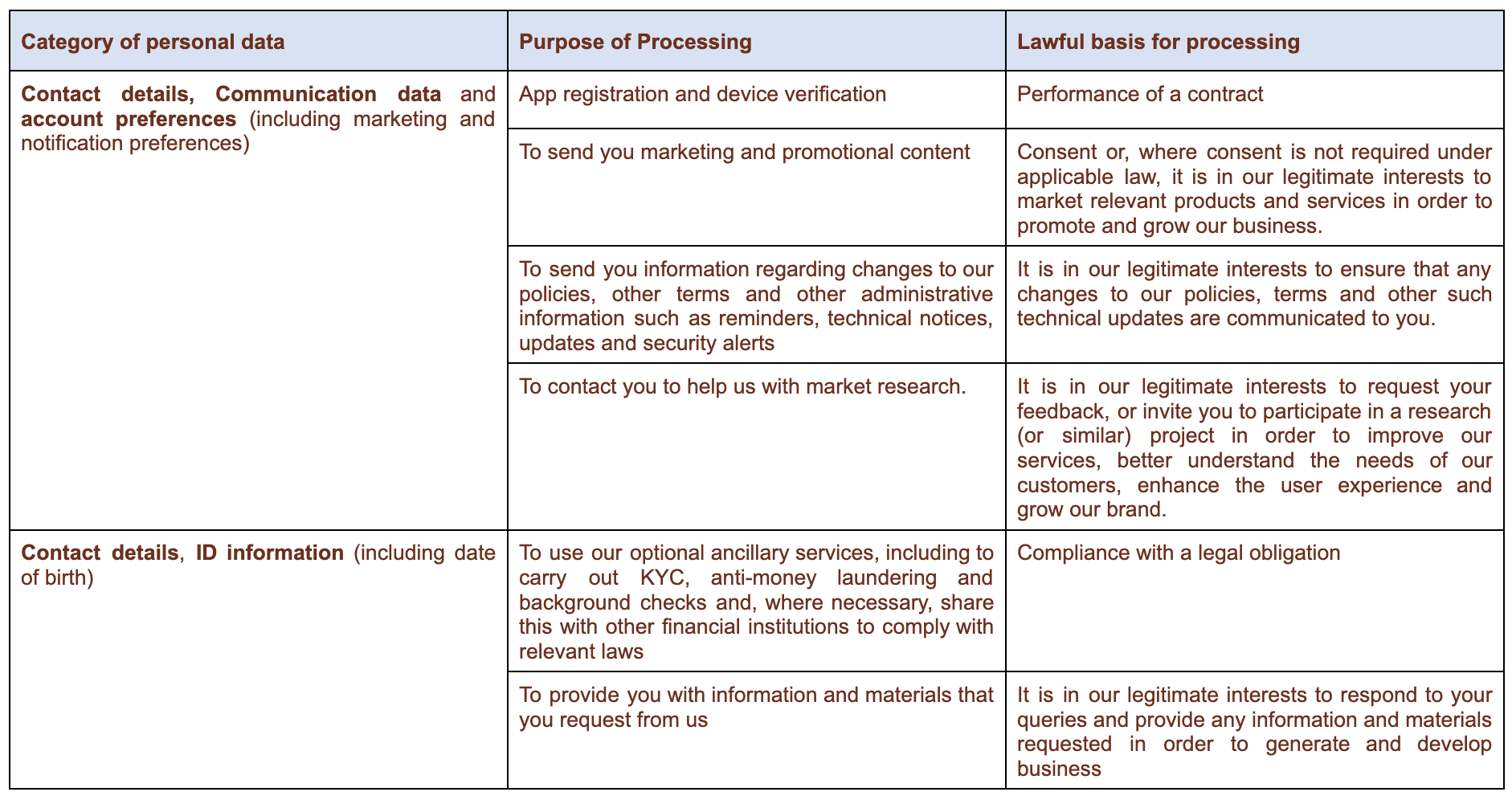 The table at Annex 1 sets out the categories of personal information we collect about you and how we use that information. The table also lists the legal basis which we rely on to process the personal information.